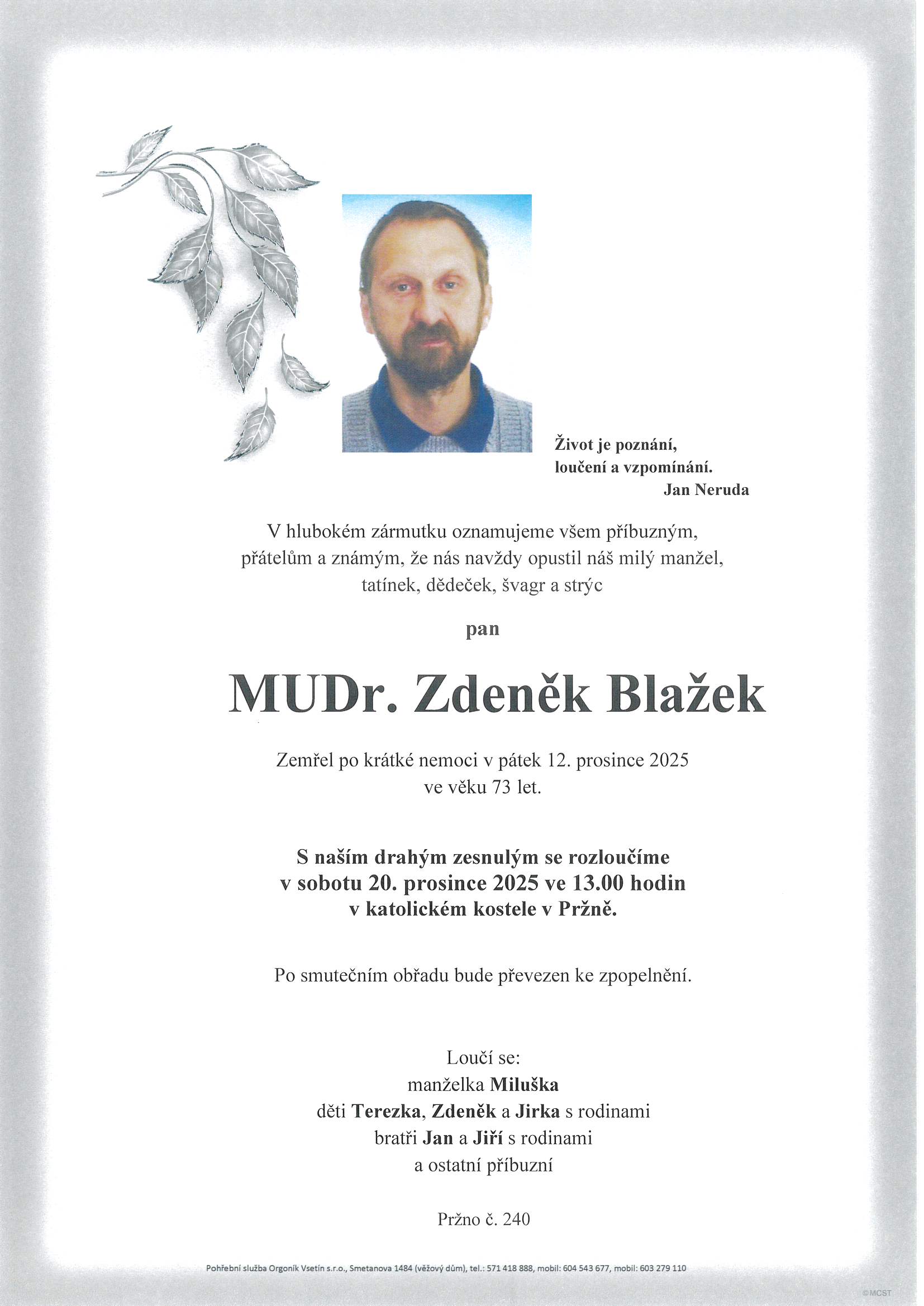 Úmrtí MUDr. Zdeněk Blažek MUDr. Zdeněk Blažek |