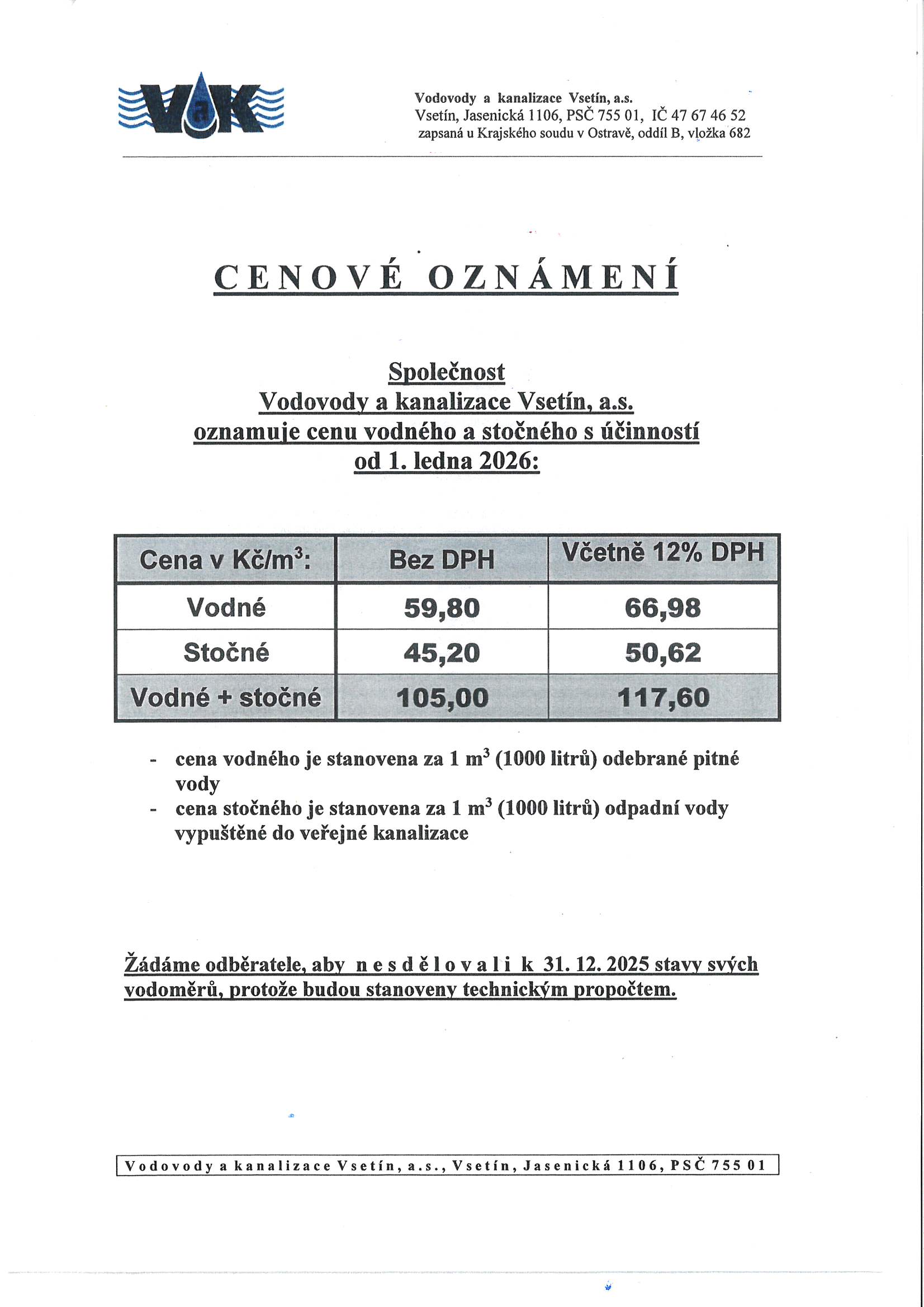 Cena vodného a stočného společnosti Vodovody a kanalizace Vsetín, a.s. pro r. 2026